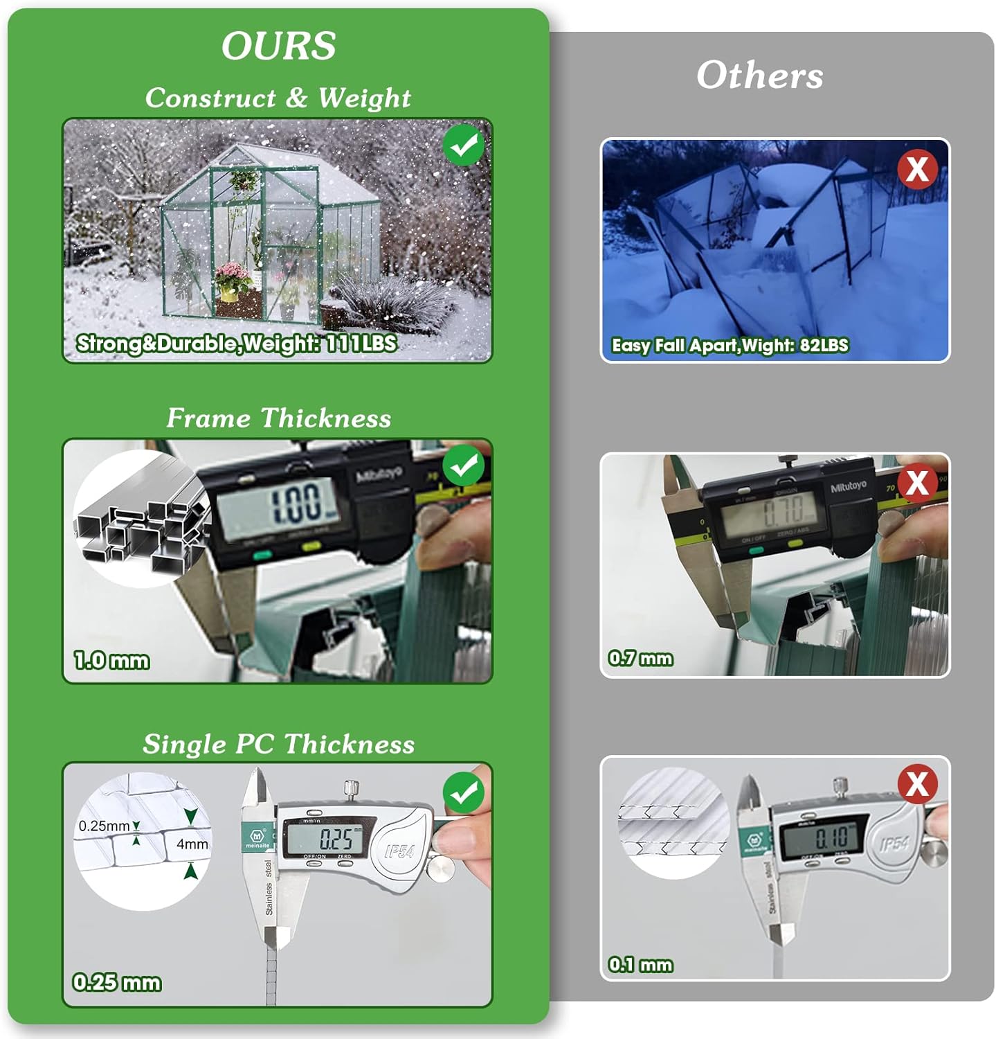 In conclusion, the “Upgraded 6.2′ x 10.2′ Hobby Polycarbonate Greenhouse Kit” is a top-of-the-line option for gardeners looking to take their plant growth to the next level. With premium panels, a heavy-duty aluminum frame, humanized design features, and high stability considerations, this greenhouse has everything you need for a successful garden. Plus, with a 12-month warranty and excellent customer service, you can purchase with confidence knowing that your plants are in good hands. Add this greenhouse to your backyard or garden today and watch your plants thrive all year round.
